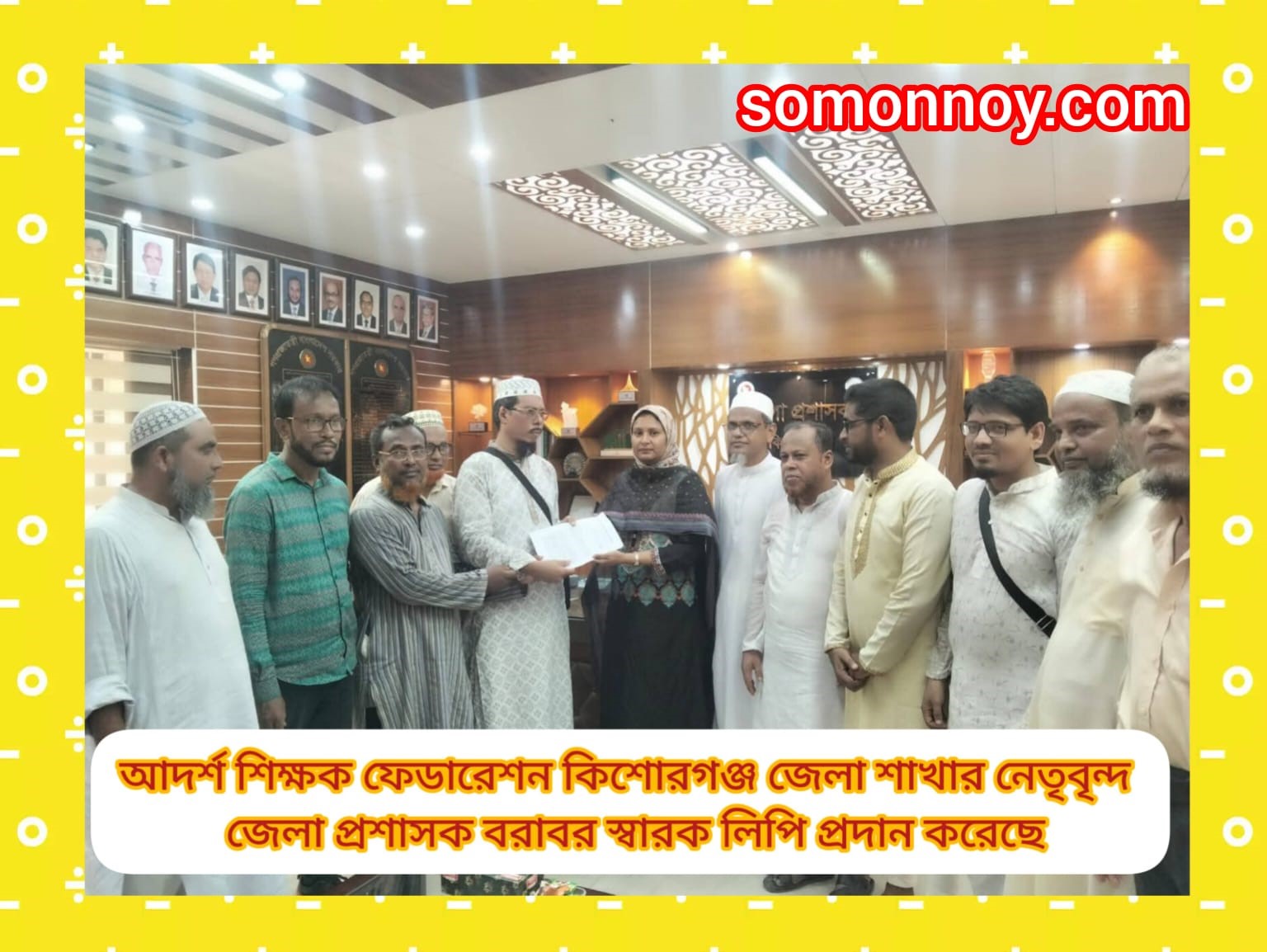সোমবার (২০ অক্টোবর) সকালে বাংলাদেশ আদর্শ শিক্ষক ফেডারেশন কিশোরগঞ্জ জেলা শাখার উদ্যোগে স্থানীয় শহীদি মসজিদ চত্বরে সংক্ষিপ্ত সমাবেশ শেষে মিছিল সহকারে কিশোরগঞ্জ জেলা প্রশাসকের কার্যালয়ে গিয়ে সমবেত হয়। পরে নেতৃবৃন্দ কিশোরগঞ্জ জেলা প্রশাসকের দপ্তরে গিয়ে জেলা প্রশাসক ফৌজিয়া খানের হাতে স্মারক লিপি তুলে দেন।