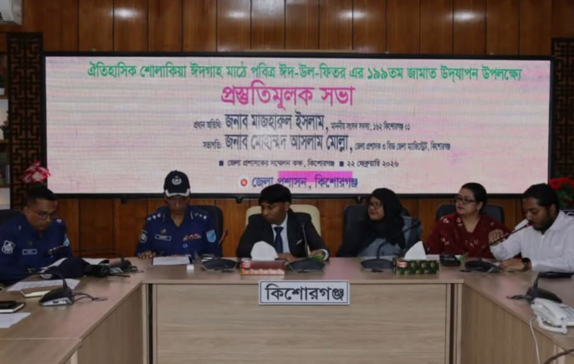 রবিবার (২২ ফেব্রুয়ারী) বিকালে কিশোরগঞ্জ জেলা প্রশাসকের সম্মেলন কক্ষে  ঐতিহাসিক শোলাকিয়া ঈদগাহ মাঠে পবিত্র ঈদ-উল-ফিতরের ১৯৯তম জামাত সুষ্ঠ ও শান্তিপূর্নভাবে অনুষ্ঠানের জন্য প্রস্তুতিমূলক সভা অনুষ্ঠিত হয়েছে।